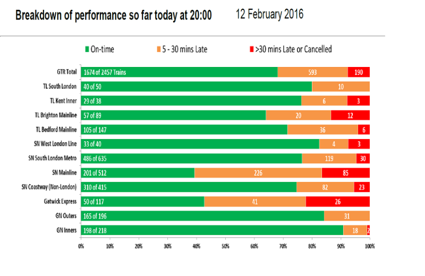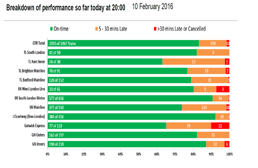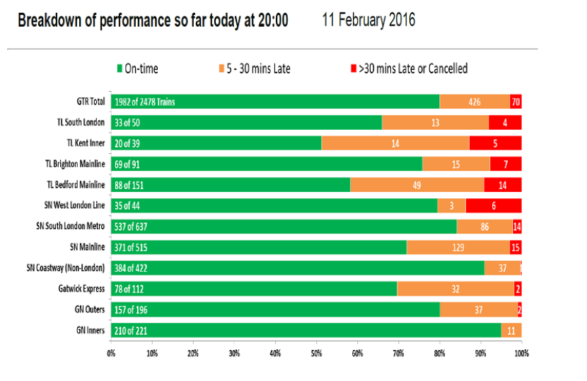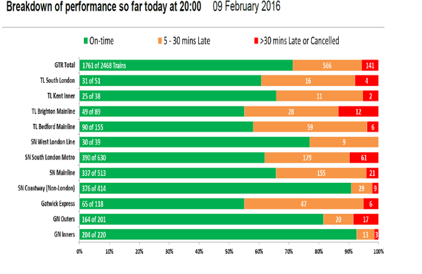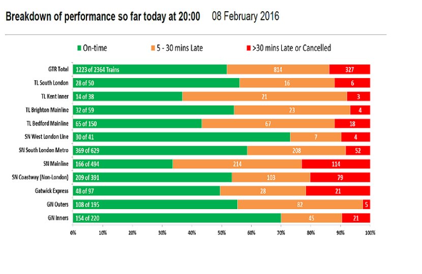 Southern's performance was a little better than the previous week. Although the Gatwick Express line again saw heavy disruption on Monday and Friday, whilst Monday was a particularly bad day with no fewer than 327 journeys delayed by 30 minutes or more and over 1100 delayed by more than 5 minutes.