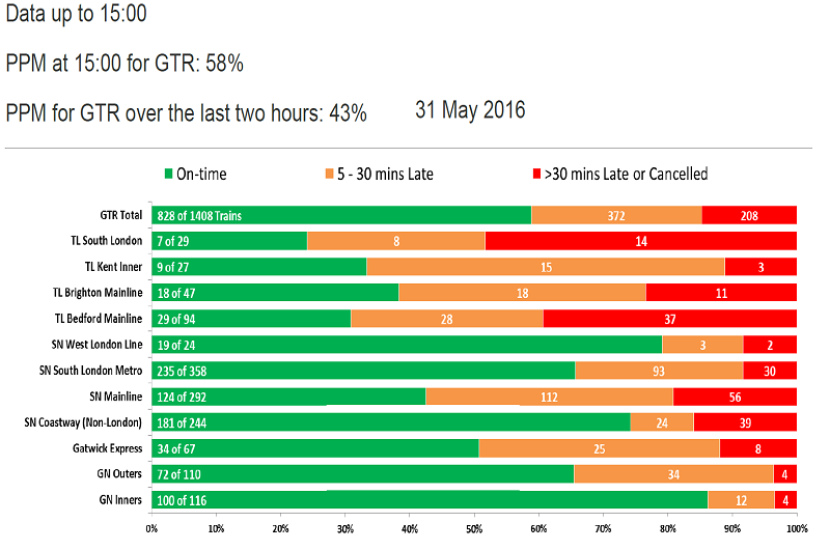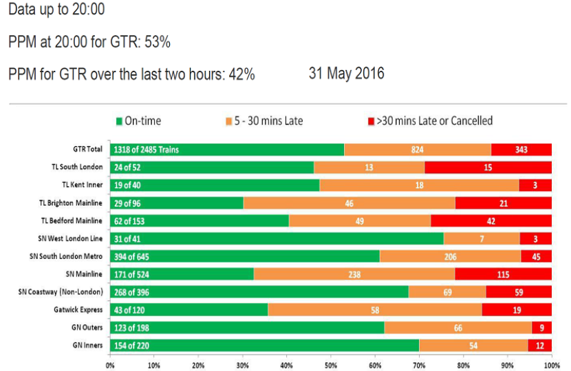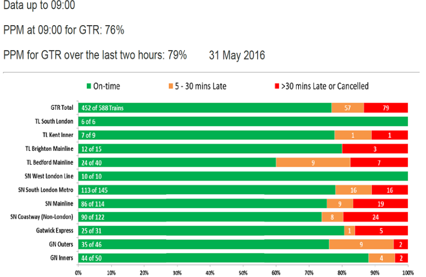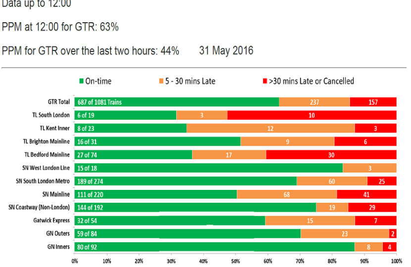 GTR use the industry standard Public Performance Measure (PPM), which for London & South East operators means arrivals at destinations within five minutes of published time (i.e. arrival on time or up to four minutes 59 seconds late). This morning the PPM fell below 80%, meaning 20% of all GTR services were delayed by more than 5 minutes, in fact more were cancelled or delayed by at least 30 mins, than those delayed between 5 - 30mins.