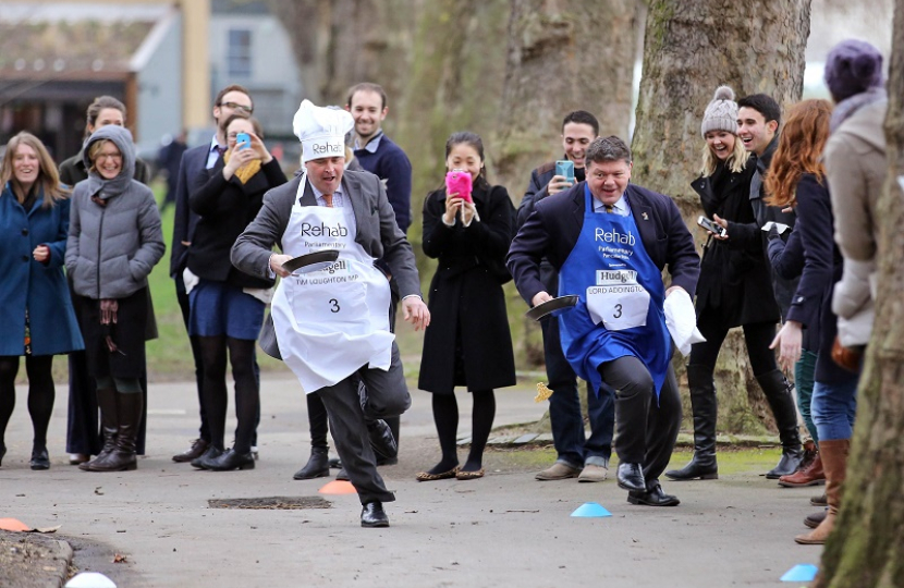 In an egg-citing finish to this year's Rehab Parliamentary Pancake Race in London, the MPs' Team flattened our opposition to scoop victory at the annual showdown of Westminster's finest. The race in support of the disability charity, Rehab, took place the morning of 9 February 2016 in the shadows of the Houses of Parliament in Victoria Tower Gardens.
